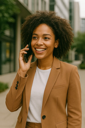 Cheerful woman in suit speaking on smartphone in modern city district. Urban corporate communication concept.
