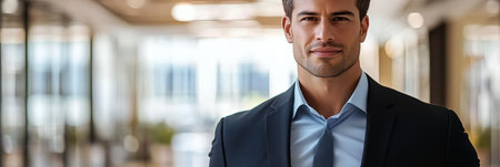 A well dressed man with a warm smile stands confidently in a contemporary office environment. Sunlight streams through large windows, creating an inviting atmosphere that enhances his professionalism.