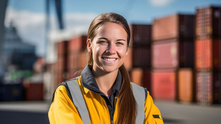 A smiling female logistics coordinator managing harbor operations, surrounded by shipping containers, ensuring efficient and timely delivery of cargo.