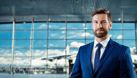 Pretty pilot with a confident smile against the backdrop of an airport.
