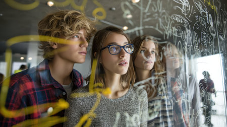 Young individuals observing creative workspace, engaged thought and curiosity. atmosphere is vibrant, filled with colorful drawings and ideas glass wall, reflecting their interest innovation