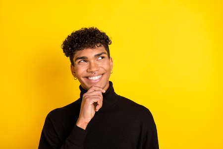 Photo of optimistic brunet guy look empty space wear black sweater isolated on vibrant yellow color background