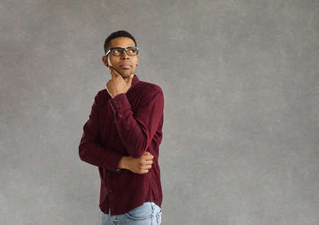 Studio portrait of pensive thoughtful young african american man in glasses touching chin looking over shoulder to side weighing pros and cons of sentence thinking. Advertisement concept