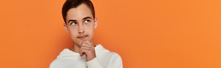 Young boy in white, ponders against orange backdrop.