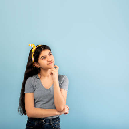 Great offer. Pensive Indian teen girl looking up at copy space and touching her chin over blue studio background