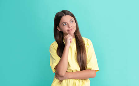 pondering teen girl with long hair on blue background, making decision