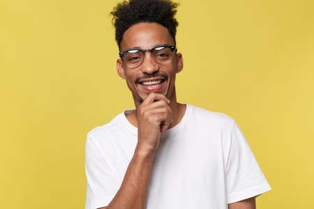 Pensive Afro Man Thinking Touching Chin Standing Over Yellow Background.