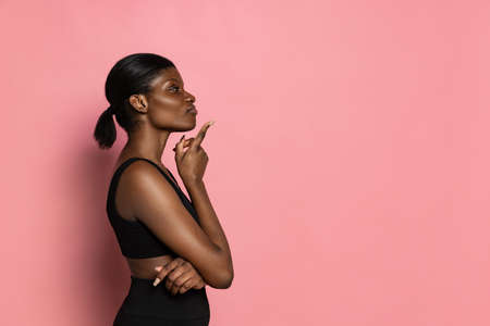 Profile view of young beautiful dark skinned woman isolated on pink studio background with copy space for ad.