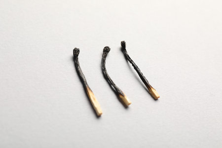 Burnt matches on light grey background, closeup