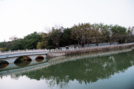 Ancient bridges and forests on the river at dusk.