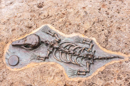 Melbourne, Australia - November 16, 2009: Closeup of Skeleton of crocodile or reptile with spread legs set in beige brown stone in park.