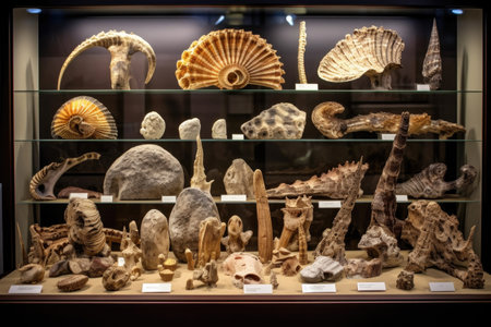 Fossils Set, Archeologic Fossil Dig Collection Isolated, Fossilized Prints of Prehistoric Plants and Animals on White Background, Museum Rocks, Jurassic Shells, Generative AI Illustration