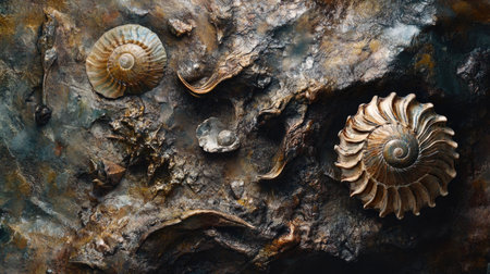 A stunning collection of fossilized shells set against a textured rock background, showcasing the beauty of natural history and geological formations.