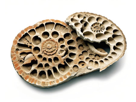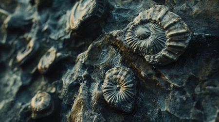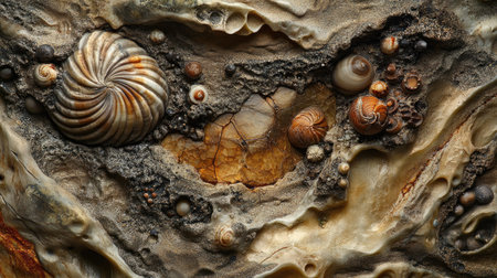 This close-up image showcases beautifully fossilized sea creatures, revealing intricate textures and details. Perfect for nature and geology enthusiasts.