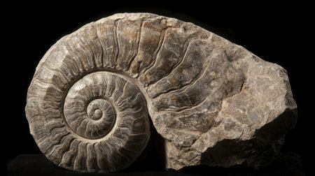 AI Generated. Fossilized ammonite imbedded in rough dark textured stone surface