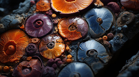 Captivating view of fossilized sea creatures embedded in a rock surface, showcasing intricate details and vibrant colors that reflect ancient marine environments.