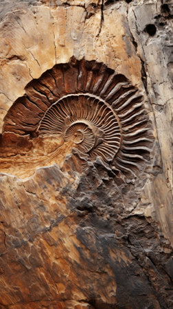 A close-up view of a fossilized ammonite shell showcases its intricate spiral pattern and earthy colors. This specimen is discovered in a rocky geological formation, illustrating natural history.