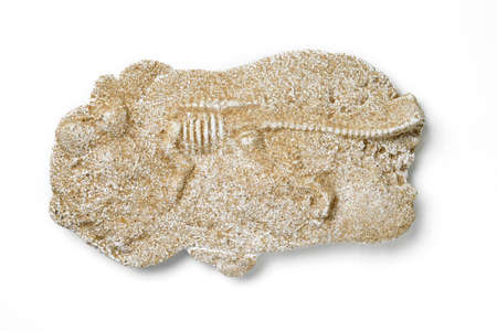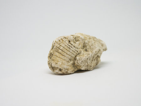 Animal head shape piece of limestone with embedded fossils, isolated on white.