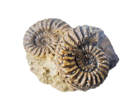 Kosmoceras ammonite fossil of the Jurassic period over white background