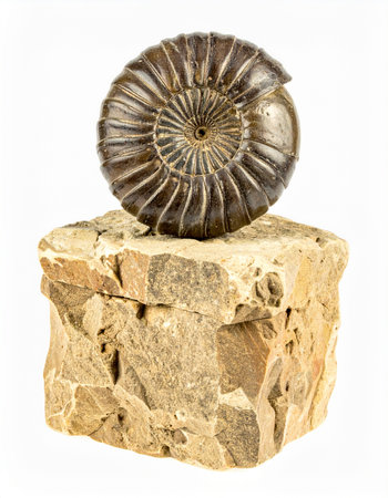 A perfectly preserved ammonite fossil, a relic from the Jurassic period, rests upon a stone pedestal.