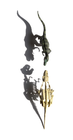 top view tyrannosaurus toy and tyrannosaurus skeleton on a white background with shadows