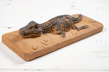 A captivating dinosaur fossil skeleton rests on a textured stone surface, showcasing the unique bone structure and sparking curiosity in paleontological research.