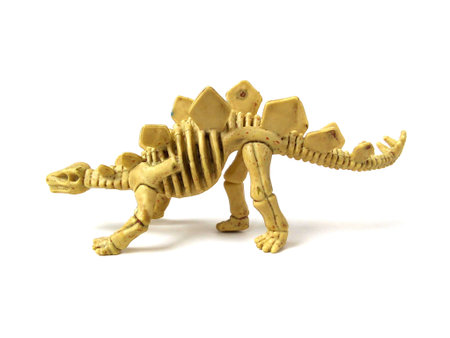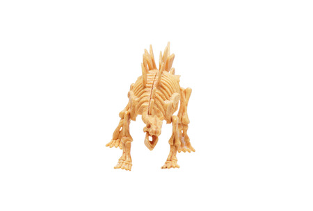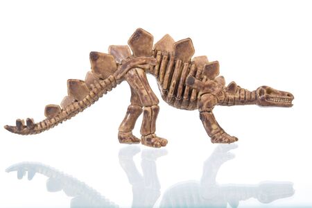 Close up of stegosaurus skeleton dinosaur toy isolated on white background.