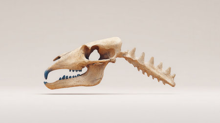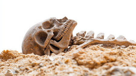 A collection of bones and other objects, including a skull, are arranged in a pattern on a white background. Concept of curiosity and fascination with the natural world