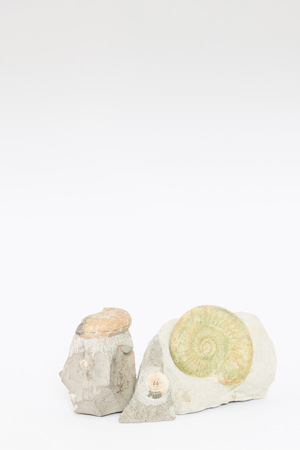 Ammonite fossil shell. Whole of an ancient ammonite lie on a light background. Whole of a sawn ammonite fossil shell.