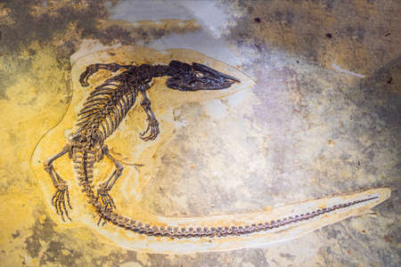 Fossil dinosaur lizard. Fossil of prehistoric lizard skeleton on the rock