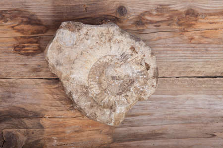 Nautilus fossil in stone on wooden background