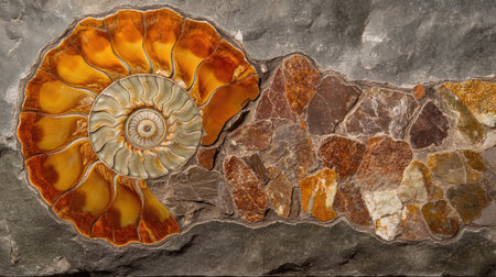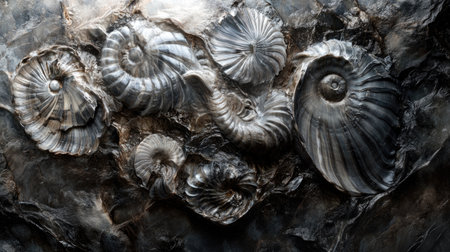 A stunning collection of fossilized shells set against a textured rock background, showcasing the beauty of natural history and geological formations.