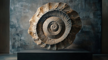 A breathtaking large ammonite fossil sculpture showcases the intricate details of ancient life, beautifully contrasting with a modern, textured backdrop in this artistic space.