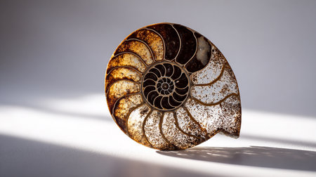 nautilus shell on a white background with shadow from the sun