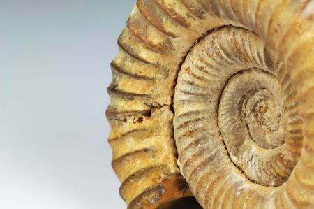 Fossil of ammonite. Macro shot of an ammonite fossil, possessing the typically ribbed spiral-form shell