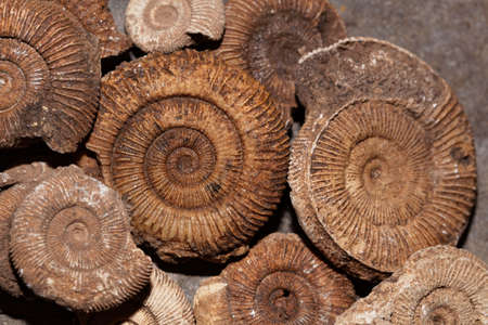Fossils of the ammonites in the rock close-up