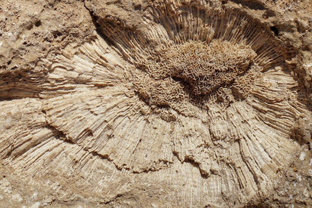 Closeup of large fossilized coral polyps in red rock forms wide flower petal.