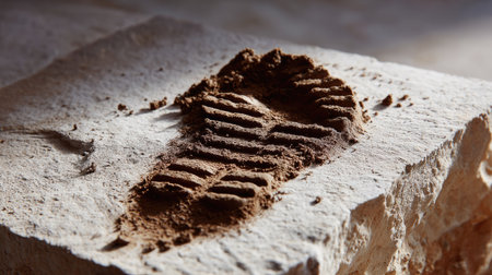 Detailed imprint shows a footprint on a gray surface, capturing the texture and contours of the ground in a simple and natural setting.