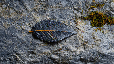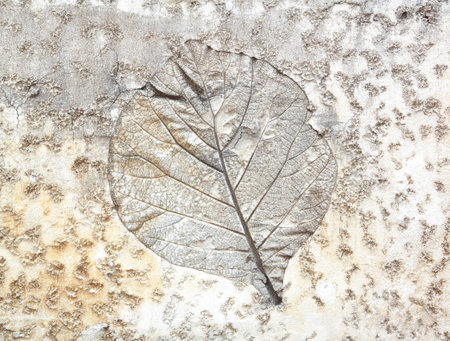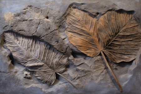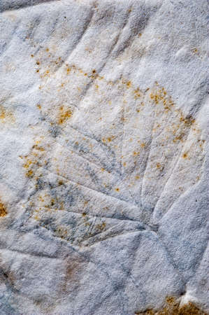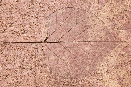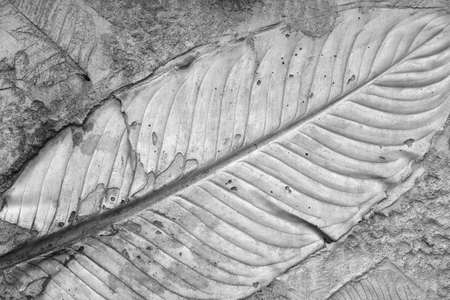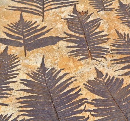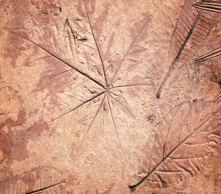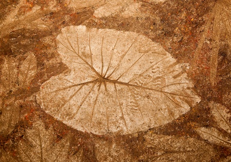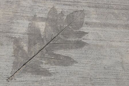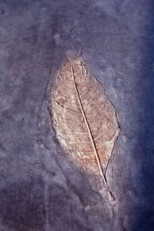 Fossil leaf in stone. Fossil record of dead old plants. Paleontological texture imprint on stone.