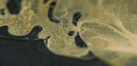 Blur paint spilling. Glow fluid. Defocused yellow black color shiny particles viscous texture oil drip ink water mix on abstract art background.