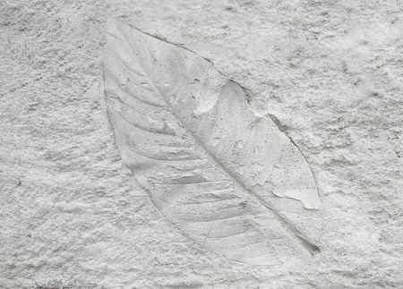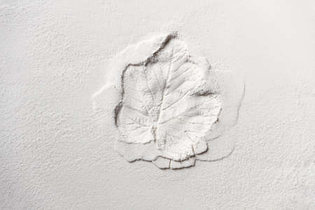 Silhouette of tree leaf printed on smooth flat surface. Top view of white dust, sand blow, flour, powder. Abstract grainy texture. Autumn nature pattern background concept. Process of cooking.