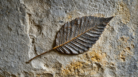 A fine leaf lies flat on a rough background showing its detailed structure and elegance.