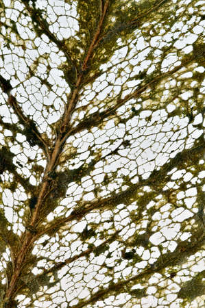 Detailed leaf skeleton decay close up on white background showing mesh of veins. Natural texture useful for wallpaper or nature background.
