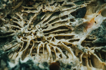 Detailed macro shot of fossil imprints on a weathered limestone rock, capturing the texture and timeless essence of Earth's ancient past.