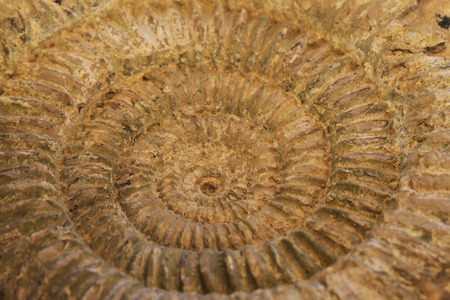 Fossil of ammonite. Macro shot of an ammonite fossil, possessing the typically ribbed spiral-form shell