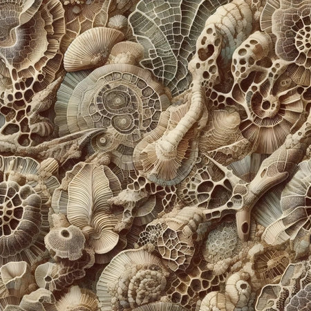 This close-up image showcases fossilized sea creatures embedded in an ancient surface, highlighting intricate textures and organic forms from natural history.