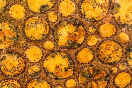 Patterns in a cut and polished slab of fossilized wood, close up.