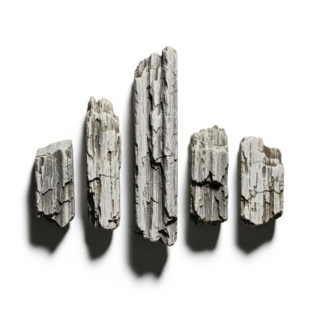 This image showcases a close-up of a wooden beam, possibly from an old structure, surrounded by rocks and dry earth. The wood displays intricate grain patterns and natural textures. The composition suggests an outdoor environment with warm lighting. It could be suitable for various commercial or editorial applications.