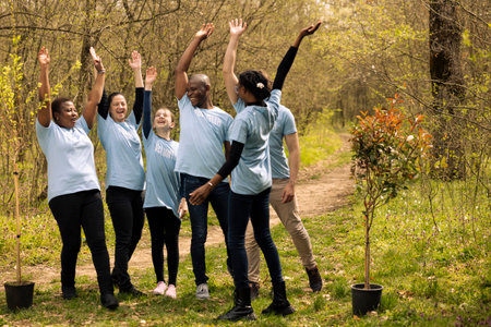 Diverse team of activists uniting hands in celebration after a successful mission of preserving nature, fighting for reforestation. Group of people joining forces to grow more trees in the woods.