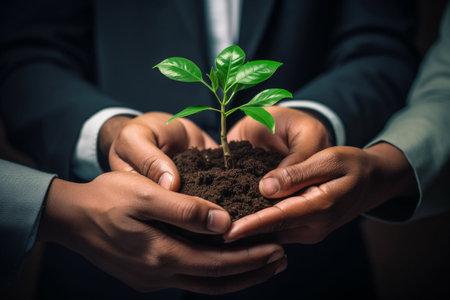 Lend me a breath that I could borrow. .Shot of a group of unrecognizable businesspeople holding a plant growing out of soil.